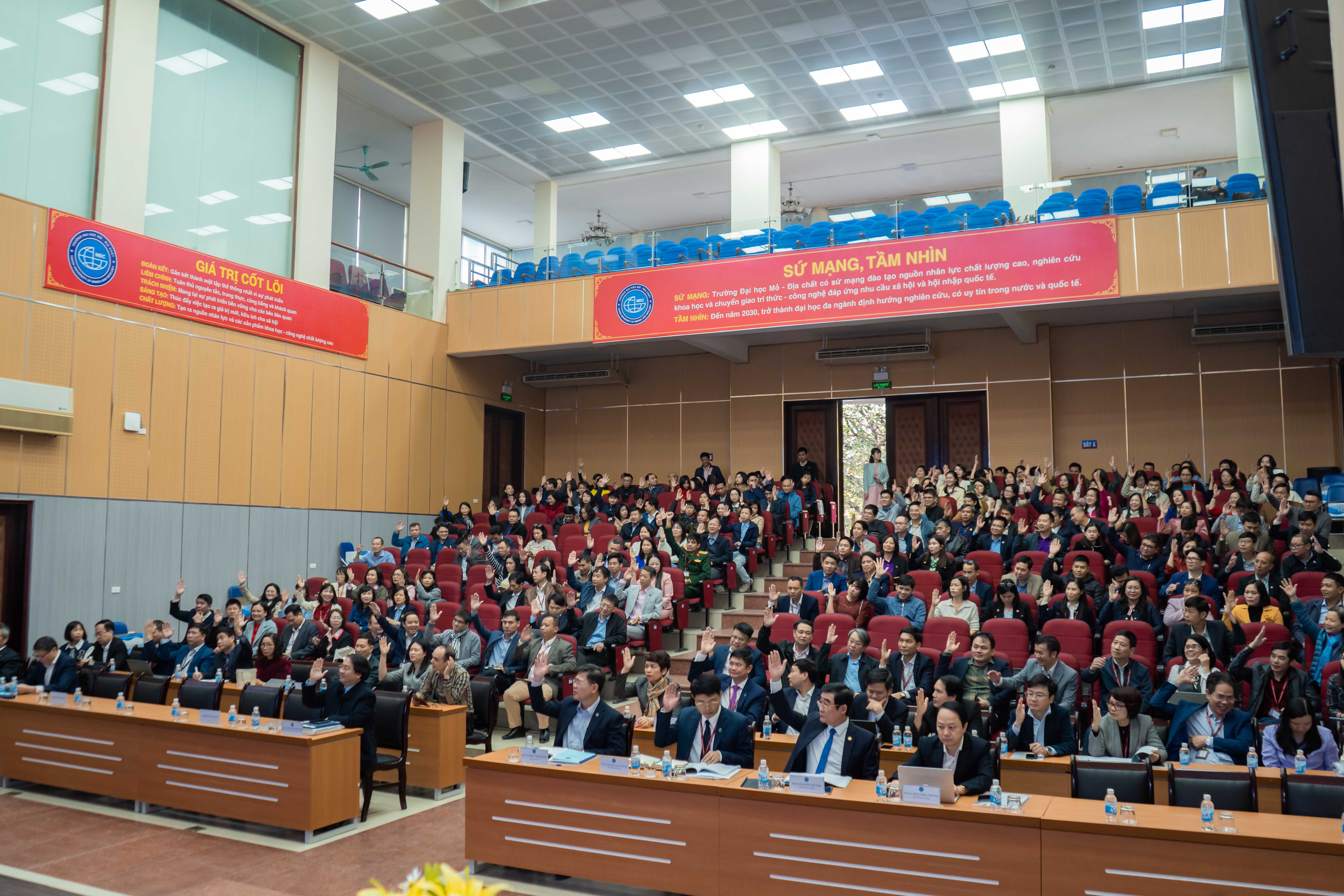 Toàn thể đại biểu đã biểu quyết nhất trí và quyết tâm thực hiện Nghị quyết Hội nghị Đại biểu Viên chức lần thứ 52, hướng tới mục tiêu xây dựng HUMG trở thành trường đại học định hướng nghiên cứu, hội nhập và phát triển.