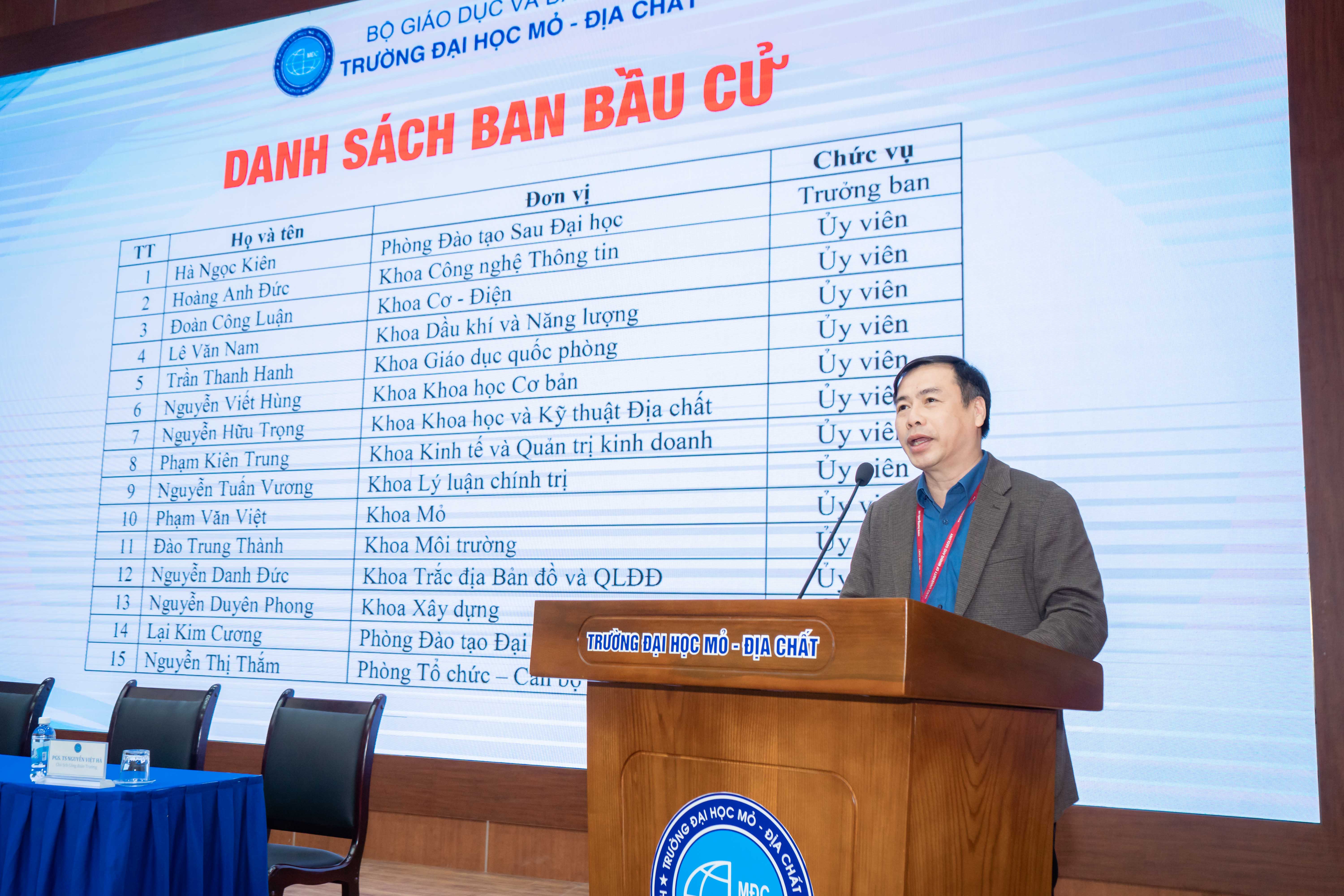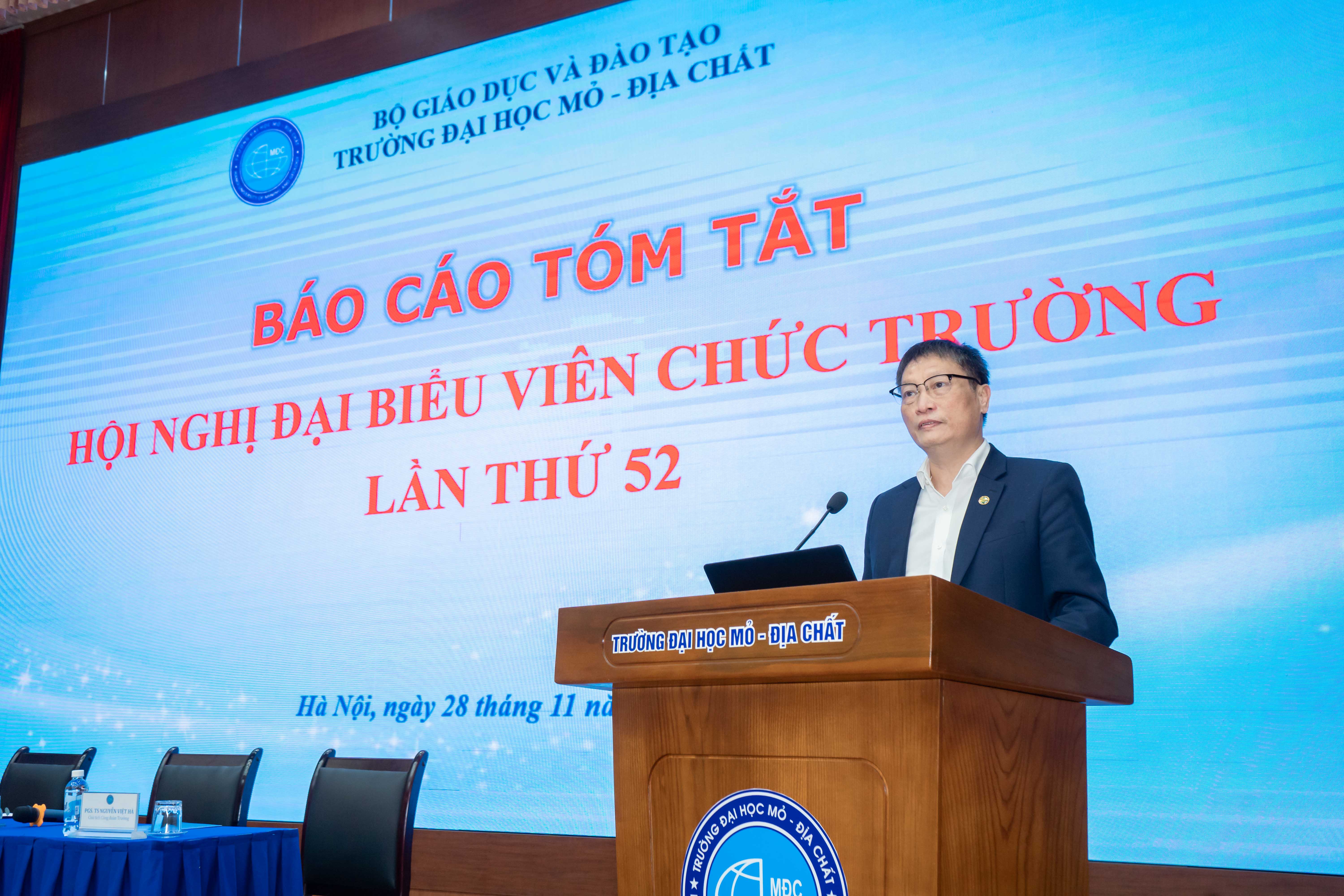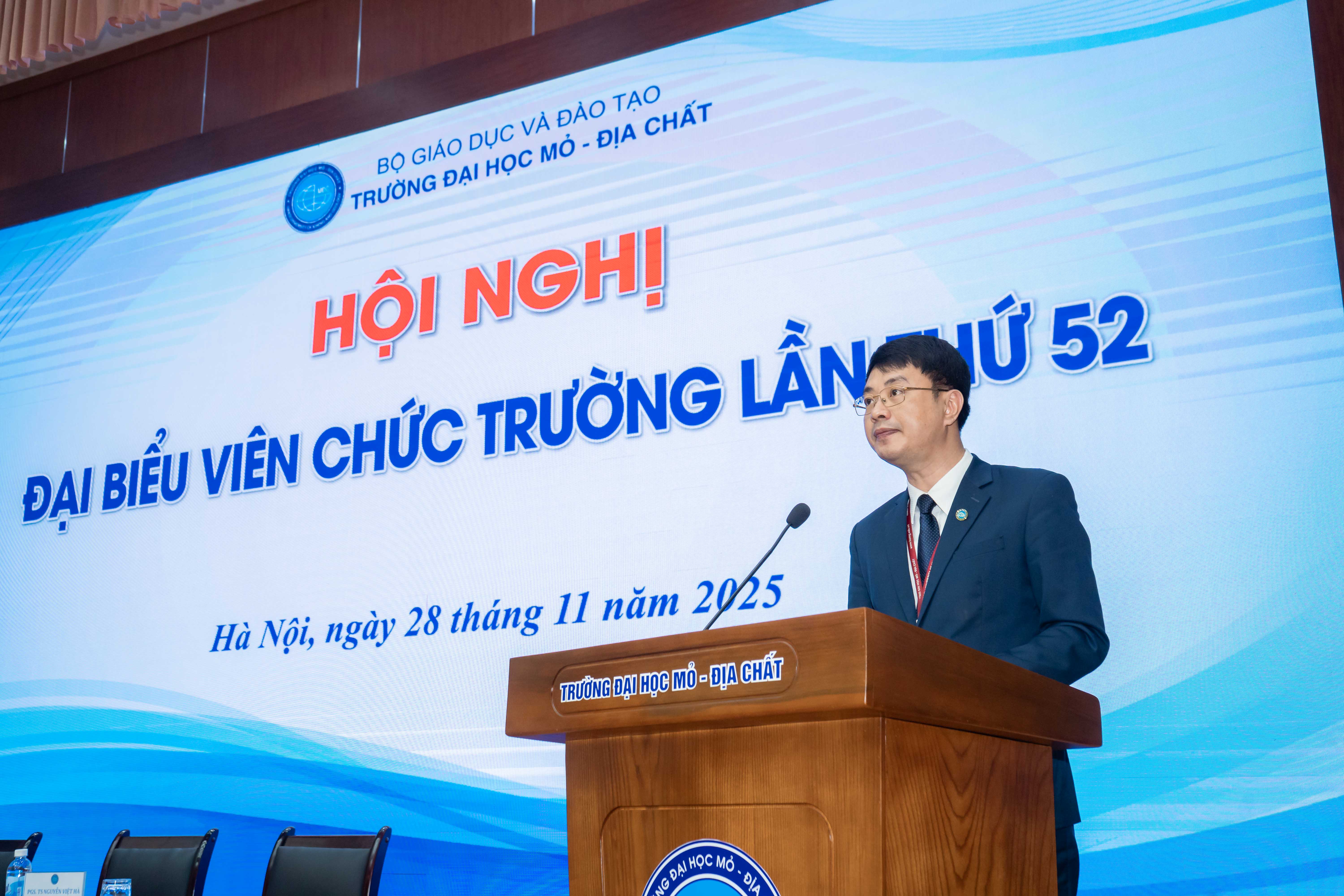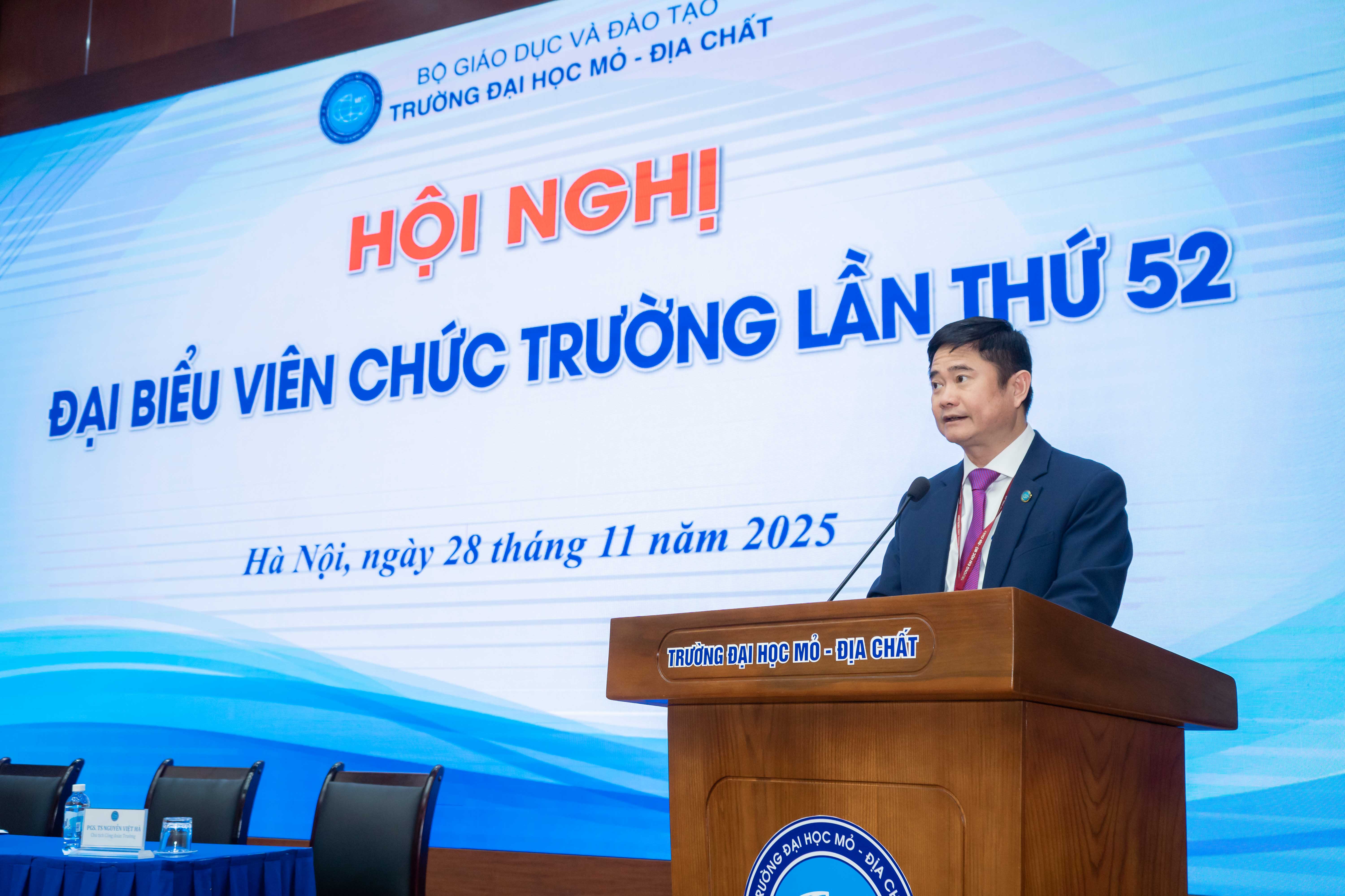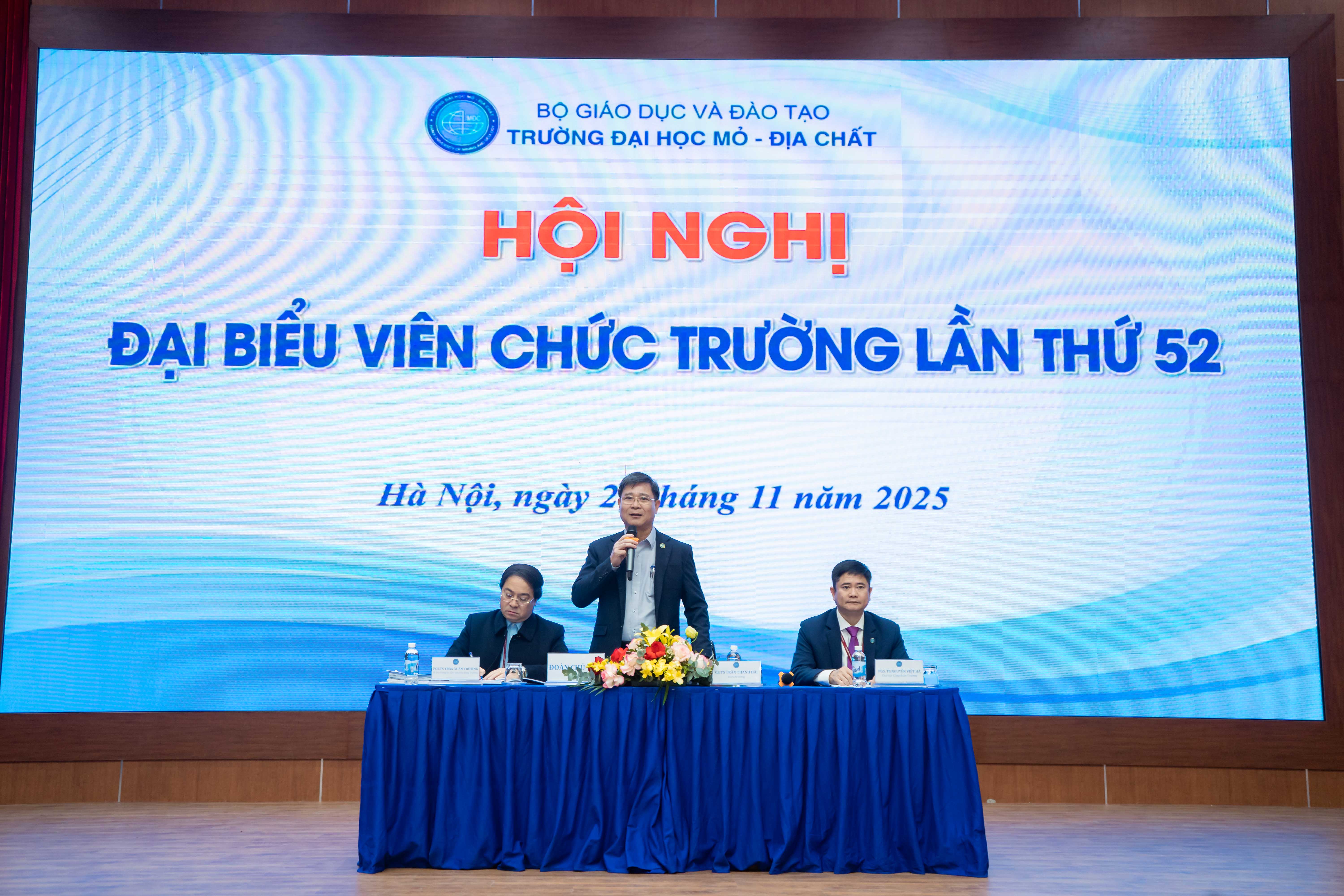 Ngày 28/11/2025, Trường Đại học Mỏ - Địa chất (HUMG) đã tổ chức Hội nghị Đại biểu viên chức lần thứ 52. Hội nghị đã nhất trí bầu Đoàn chủ tịch gồm PGS.TS Trần Xuân Trường - Bí thư Đảng uỷ, Chủ tịch Hội đồng trường; GS.TS Trần Thanh Hải - Hiệu trưởng và PGS.TS. Nguyễn Việt Hà - Chủ tịch Công đoàn trường điều hành Hội nghị; Đoàn Thư ký gồm TS. Bùi Mạnh Tùng và ThS. Nguyễn Thị Thu Thảo. Hội nghị có sự tham dự của các Phó Hiệu trưởng: PGS.TS Nguyễn Ngọc Khánh, PGS.TS Nguyễn Thế Vinh, PGS.TS Triệu Hùng Trường, TS Nguyễn Cao Khải - Chủ tịch Hội cựu chiến binh trường, hơn 200 đại biểu được bầu từ các đơn vị trong trường, cùng các đại biểu khách mời là các Giáo sư, Nhà giáo nhân dân, Nhà giáo ưu tú đang công tác, chủ tịch Hội cựu giáo chức, Chủ tịch Hội sinh viên trường, Trưởng và phó các phòng, khoa, trung tâm, văn phòng Nhà trường.