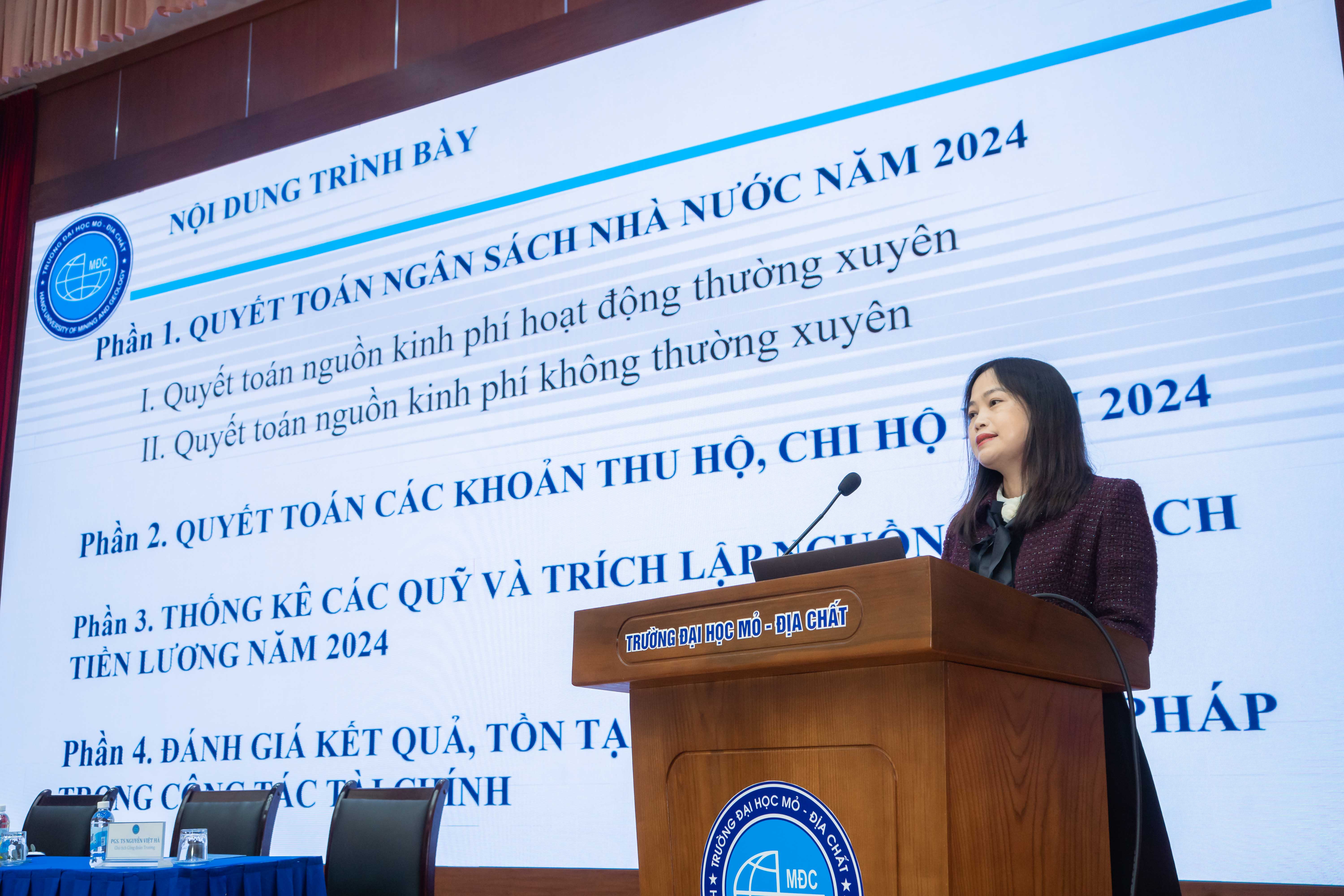 Sau phần trình bày báo cáo của PGS. TS Bùi Trường Sơn - Trưởng phòng HCTH, các đai biểu đã được nghe ThS. Phạm Thị Thu Thuỷ – Trưởng phòng Kế hoạch – Tài chính đã trình bày báo cáo công khai tài chính năm 2024, tổng hợp tình hình thu – chi, sử dụng ngân sách và các định hướng trong công tác tài chính của Nhà trường.